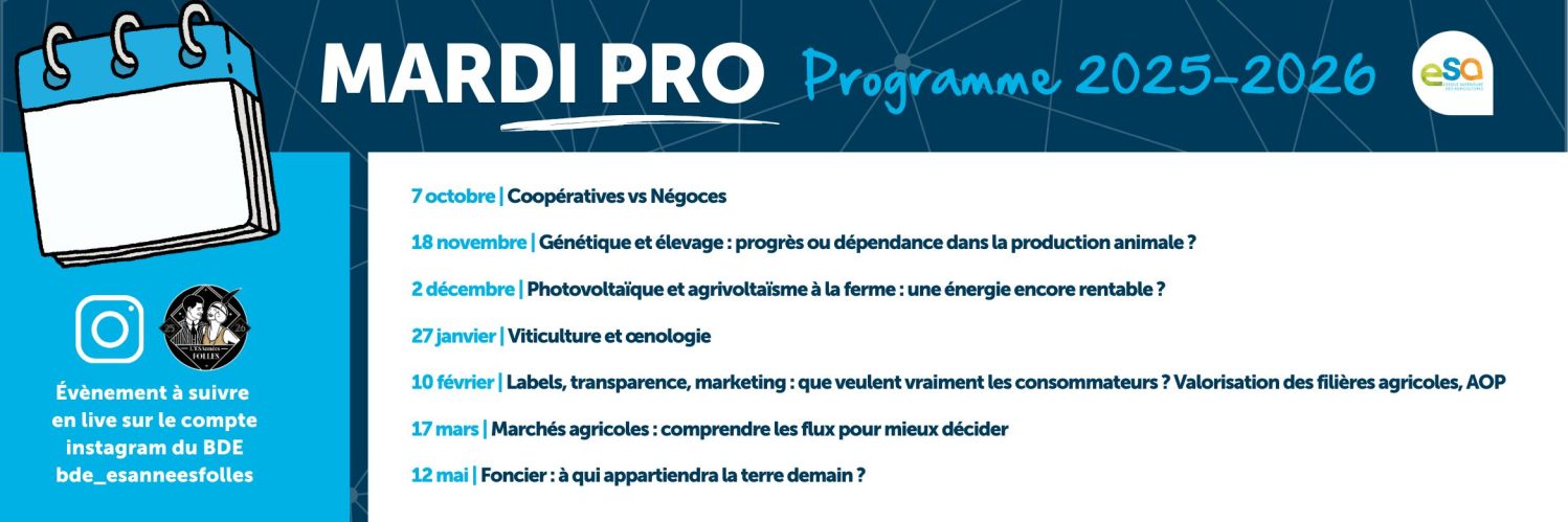 Organisés par le BDE ESAnnées Folles (BDE Ingénieur), les Mardis pro sont des conférences sur des thèmes variés autour de l'agri-agro. Des entreprises partenaires de l'ESA viennent intervenir plusieurs mardis soirs par an à l'ESA devant un public étudiant et alumni.